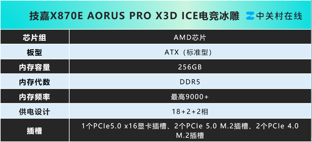 9800X3D是基于Zen5架构与台积电4nm工艺打造,拥有8核心16线程。其基础频率为4.7GHz,加速频率可达5.2GHz,配备8MB二级缓存及96MB三级缓存,搭载了第二代3DV-Cache技术。相信大部分玩家对于9800X3D都不会陌生,所以我们就不做过多的介绍,主要来看下X870E AORUS PRO X3D ICE 电竞冰雕。