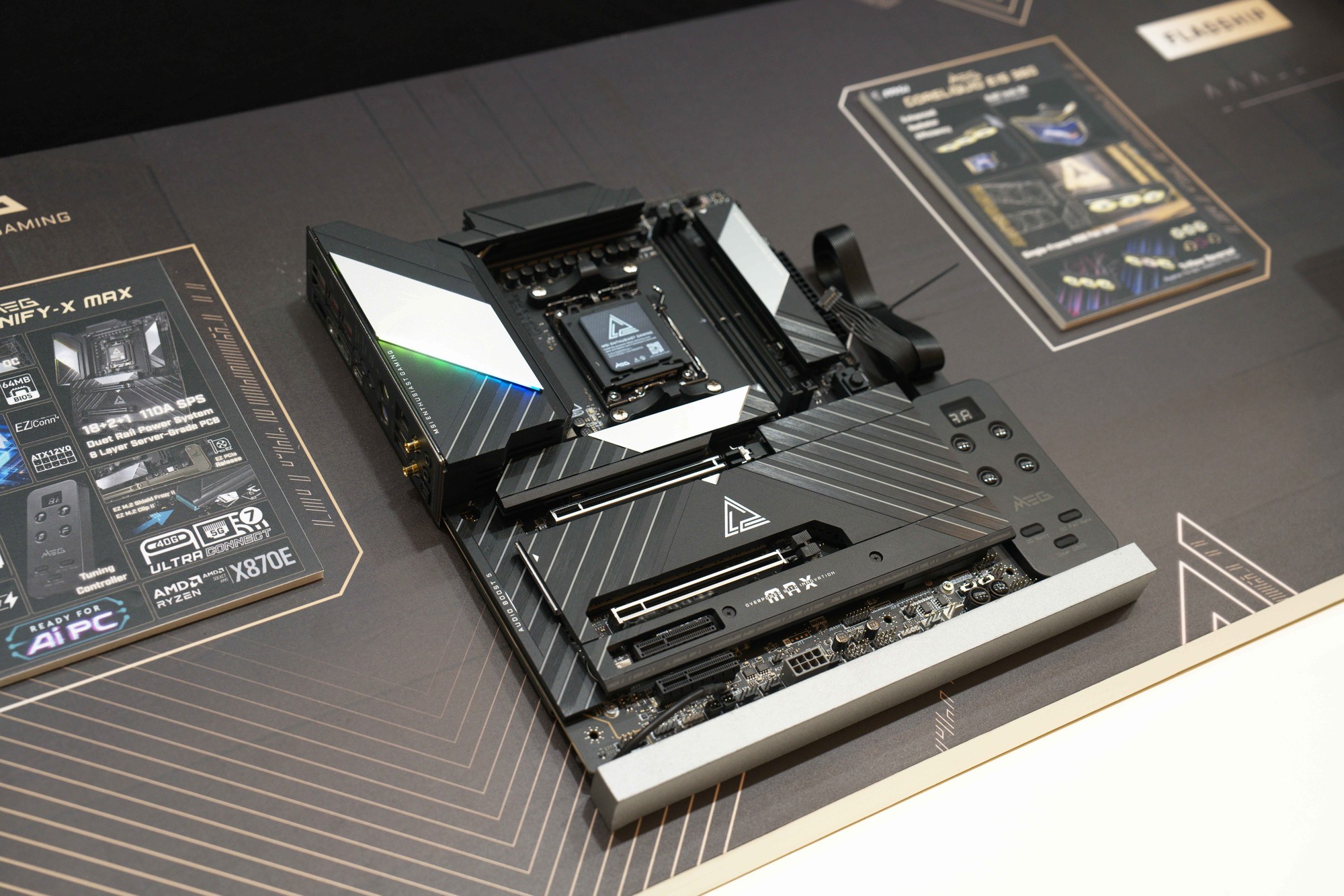 专为极限超频玩家打造的MEG X870E UNIFY-X MAX暗影是本次CES的亮眼新品,其凭借MSIOCEngine与专属2-DIMM内存布局,旨在突破CPU及DDR5性能极限。外观采用银黑撞色设计,配合“X”主题元素,尽显性能本色。其背后搭载了奢华的散热系统——直触式交叉热管、9W/mK导热垫配合第二代免工具M.2冰霜铠甲,确保高负载下依然冷静如初。更配备系列独有的TuningController物理旋钮,一键即可完成超频调参、CMOS清除、安全模式切换及配置恢复,让硬核超频变得前所未有的便捷。