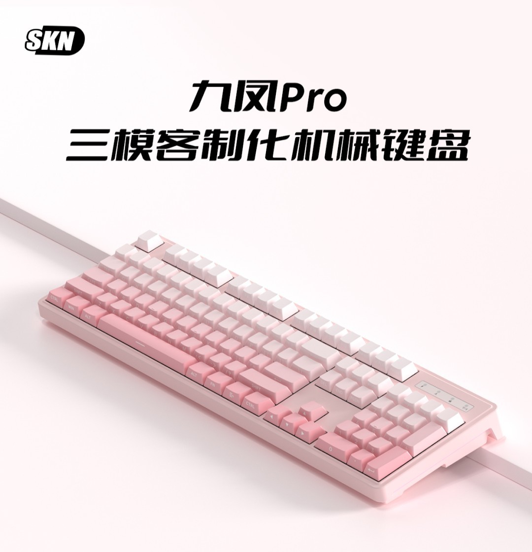 1月19日,SKN推出了新款九凤Pro机械键盘。该产品采用全尺寸配列设计,支持三模连接方式,提供粉色和黑色两种外观选择,定价均为239元。