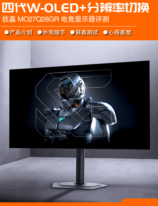 本次评测的对象,正是搭载这块全新LG第四代W-OLED面板的一款高性能电竞显示器——技嘉MO27Q28GR。该产品支持2560×1440分辨率与高达280Hz的刷新率,充分发挥W-OLED的潜力。其配备的镜面屏具备1.1%的超低反射率,可实现低至0.03ms的灰阶响应时间,大幅减少画面拖影,提升动态清晰度。此外,显示器通过VESA DisplayHDR True Black 500认证,搭载全新的Ultra Clear图像增强技术,并集成多项专为游戏玩家设计的功能,如分辨率快捷切换、自定义准星辅助、OLED VRR防闪烁技术等,全方位优化使用体验。