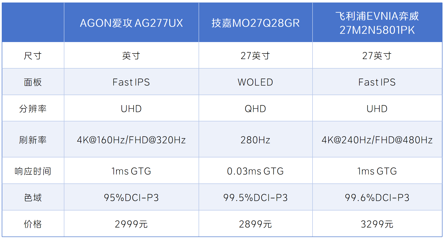 综合三款机型的核心参数与实际表现,三者在3000元价位各有侧重,分别适配不同需求的玩家,不存在绝对的最优选,但三款产品均能提供越级的使用体验。AGON爱攻 AG277UX胜在AI智能辅助与双模均衡表现,4K与320Hz的双模切换覆盖全场景,AI功能则为竞技玩家提供额外优势;技嘉MO27Q28GR凭借第四代WOLED面板,在色彩与对比度上实现同级碾压,适合追求极致画质的3A玩家与轻度创作用户;飞利浦EVNIA弈威27M2N5801PK则以顶尖护眼技术为核心,4K分辨率与480Hz超高刷兼顾,是长时间使用主机用户的最优解。因此,对于消费者而言,买自己喜欢的就好。