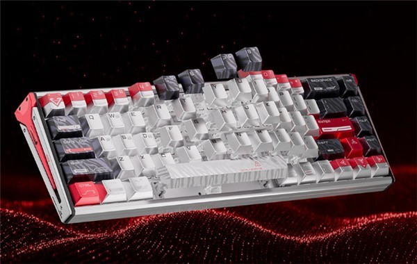 外观方面,A68键盘的外观设计灵感源自法拉利FXX K赛车,采用了类似赛车的机甲风格设计,提供头明白、金属漆两种配色。键盘外壳由220目阳极氧化铝材料制成,表面触感较为细腻。键盘两侧配有红、白、黑三层装饰板,底部则有金属格栅设计。键帽方面,官方提供了透明白和金属漆两种选择,其中金属漆版本的键帽表面工艺增强了金属反光效果。