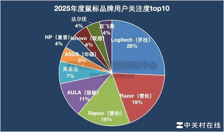 2025全年,鼠标市场品牌用户关注度依旧集中在头部大厂,排名前三的Logitech(罗技)、Razer(雷蛇)、Rapoo(雷柏)相加,占据了61%的关注度。