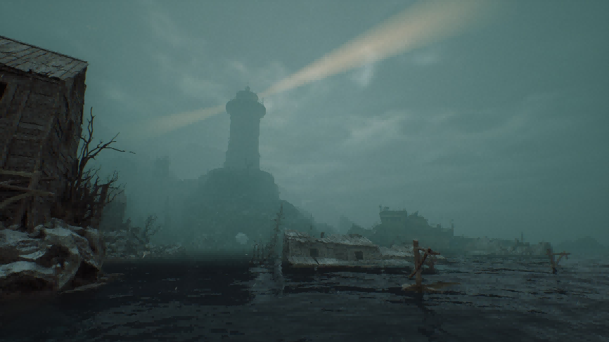 克苏鲁式的氛围营造是游戏的最大亮点。从古老村庄的破败屋舍、神秘大宅的阴森庭院,到幽邃矿井的潮湿岩壁、矗立海岸的诡异灯塔,每一处场景都流淌着洛夫克拉夫特式的诡异美学。且虚幻引擎5的加持还让这份阴森更具质感:朦胧雾气随视角流动,光影在腐朽建筑上投下扭曲阴影,即便是空无一人的巷道,也仿佛藏着窥探的目光,传达着折磨此地数百年的噩梦。