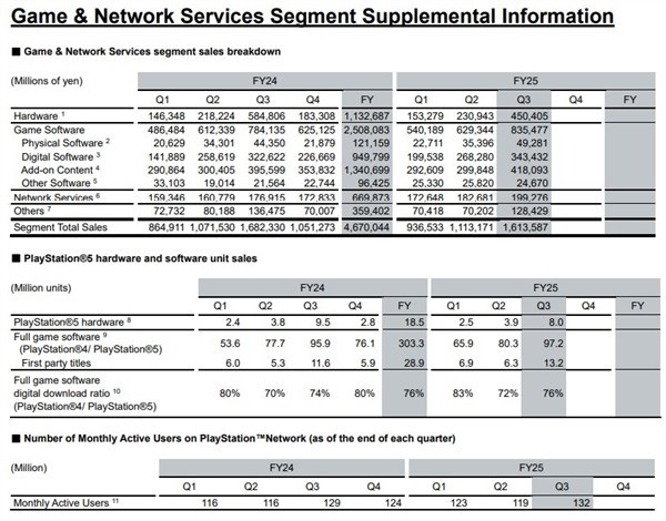 软件销售表现稳健,PS5与PS4平台合计售出游戏9720万份,较上年同比增长130万份;其中,索尼第一方独占作品销量达1320万份,同比增幅达160万份。数字版游戏持续占据主导地位,占全部游戏销量的76%,较去年同期上升2个百分点。
