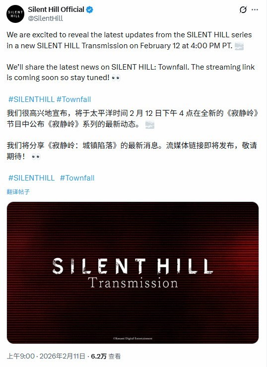 《寂静岭》官方发布重磅推文,宣布将于太平洋时间2月12日下午4点(北京时间2月13日上午8点)举办SILENTHILL Transmission特别节目,公布系列最新动态,其中备受玩家关注的《寂静岭:Townfall》将迎来专属信息披露,相关直播链接也将尽快公布。