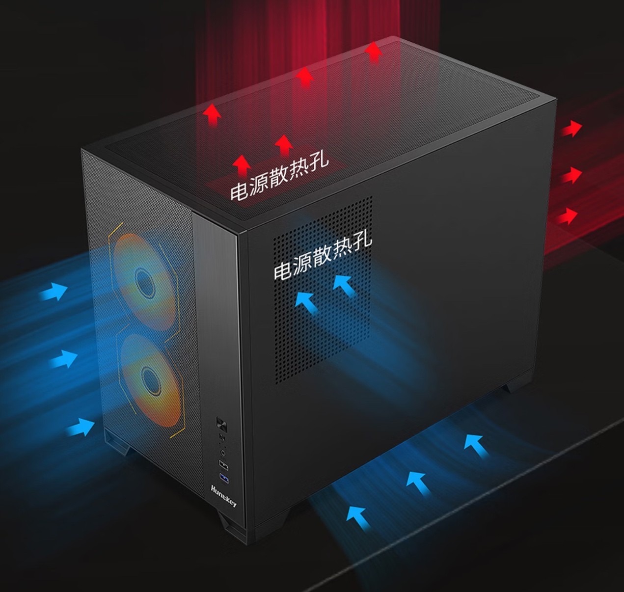 风道优化的前提的是“气流方向统一”。我们知道,热空气要比冷空气轻,因此底部进风+顶部出风无疑是最理想的风道,尤其是使用360mm/240mm水冷散热器更要严格遵循这种安装方式,把冷排的热空气抽进机箱可就不好玩了,但这就要求机箱要支持顶部安装冷排。