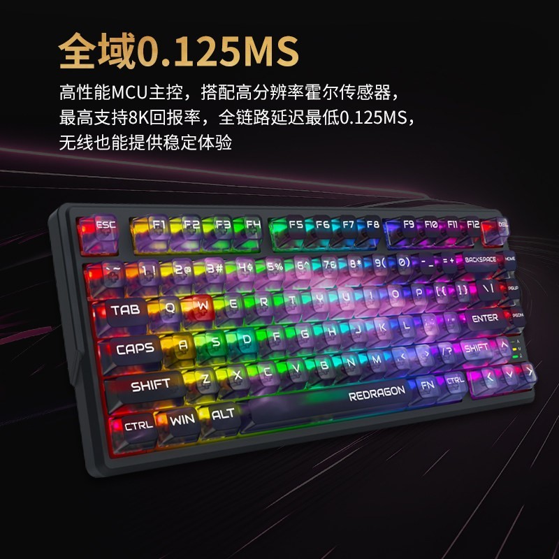 红龙 R82pro三模磁珀轴透明RGB电竞机械键盘,是一款专为游戏打造的铝坨键盘。它采用三模连接,使用起来十分便捷,磁珀轴设计带来独特的按键手感,透明外观搭配RGB灯光,电竞氛围直接拉满。