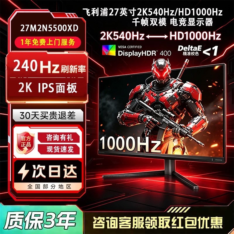 想购买显示器的朋友们别错过!飞利浦 27M2N5500XD 27 英寸电竞显示器,具备 2K 分辨率,拥有 540Hz/HD1000Hz 千帧双模,能带来超流畅的画面体验,无论是激烈的电竞游戏,还是日常观影等场景都能轻松应对。