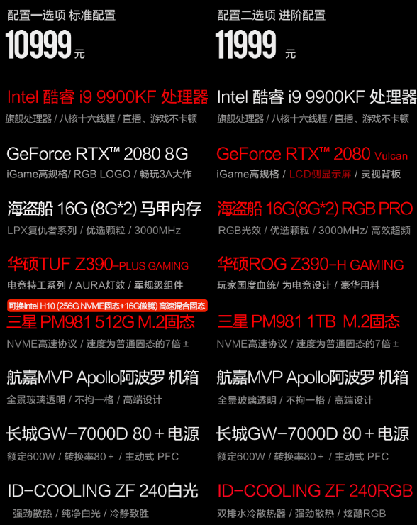 其显卡为七彩虹iGameRTX 2080,是NVIDIA今年推出的高端显卡之一,性能较上一代大幅提升。此外,这款主机还配备了ID-COOLING240水冷,华硕Z390主板,海盗船复仇者16G(8G*2)DDR4内存,频率3000,intel傲腾H10256G混合固态硬盘,长城GW-7000D电源,额定功率为600W,可以看到,每一个硬件都是目前的高端产品,这样的配置怎么能让其性能不好,稳定能不高呢?