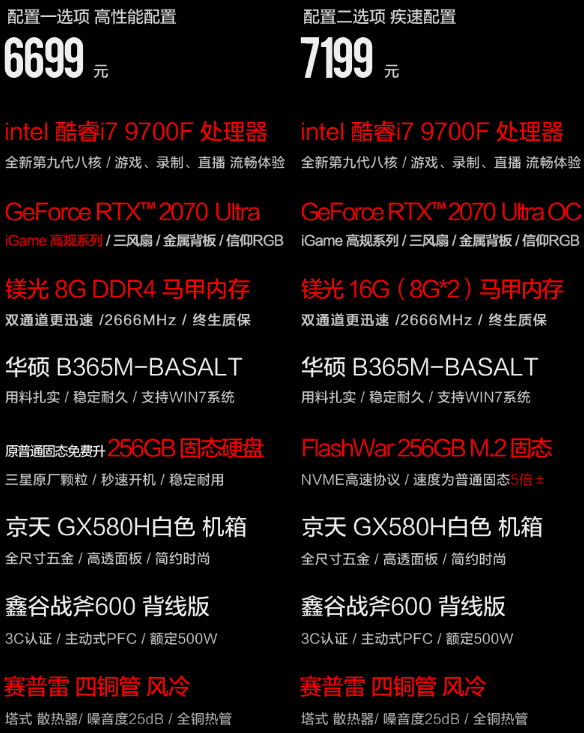 小清新仅仅是在说其外在,而其内在却有一颗躁动的心,配备了英特尔酷睿i79700F处理器,华硕B365主板,8G内存,频率为2666,标配256GSSD,还有鑫谷战斧600电源,额定500W。