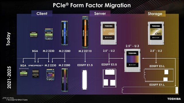 同时,东芝还在开发XD5系列的后续XD6,面向超大规模数据中心,更强带哦低功耗、低延迟,而不同于CM、CD系列的高性能、新特性。XD5采用的是M.2 22110央视,XD6会额外增加EDSFF E1.S(1U Short)。事实上,东芝对EDSFF系列接口非常感兴趣,后续还有E1.L、E3.S、E3.L等各种规格。