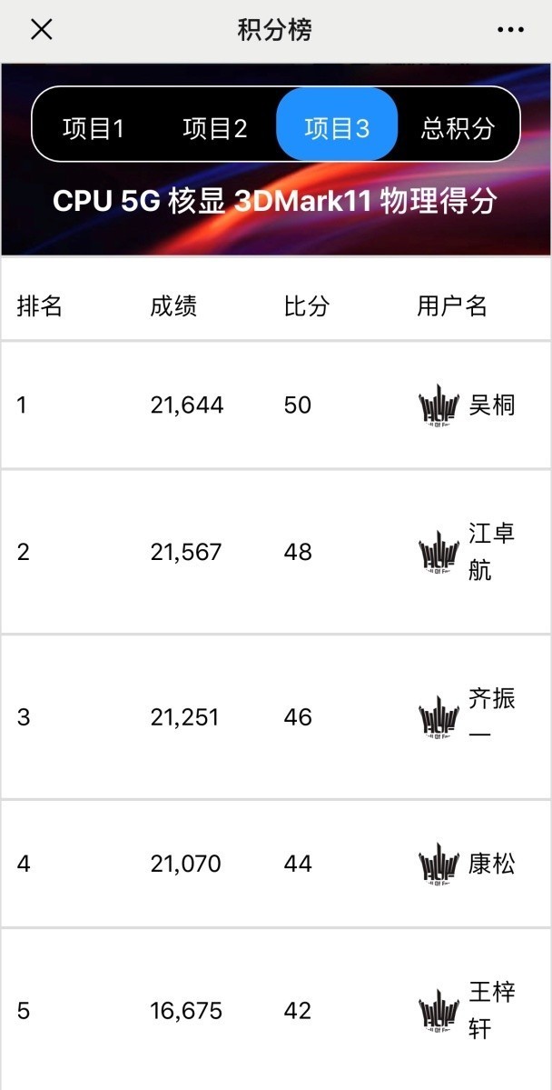 「影驰中国内存超频大赛」在线初赛由三个项目组成,分别为CPU限定5GHz主频进行3DMark11物理得分、CPU限定5GHz主频配搭核显进行3DMark11物理得分以及双通道内存频率。每周提交成绩的参赛者提供抽奖机会,共分三个阶段,(9/2-8、9/9-15及9/16-24)上传比赛成绩者即自动进入抽奖资格。在刚过去的比赛首周,暂时由选手吴桐和齐振一以总分142并列榜首,选手康松则以2分之微以总分140分暂时排名第三位,其余紧随其后的选手分别为王梓轩、江卓航、谢思骐、许涛及何耀伟等。