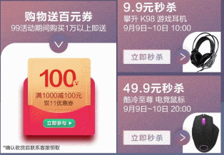 除了主机显示器等大幅优惠外,攀升(IPASON)还将为广大消费者带来秒杀精品外设的惊喜。9月9日、10日这两天上午10点整,有9.9元秒杀攀升K98游戏耳机的限时活动,晚上20点整,所有消费者亦有机会参与49.9元秒杀人体工学电竞鼠标的活动;收藏加购心仪商品,还可参与抽取888元大额红包;99活动期间购买商品总价1万元以上,还将获满1000减100元的双十一限定优惠券。