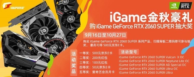 现在iGameGeForce RTX 2060 SUPER系列还开启了购卡即可参加100%中奖率抽奖,助力实现大梦想!购买iGameGeForce RTX 2060 SUPER系列产品,即可扫描背板二维码参与抽奖,具体型号为:iGameGeForce RTX 2060 SUPER Vulcan X OC、iGameGeForce RTX 2060 SUPER Neptune Lite OC、iGameGeForce RTX 2060 SUPER AD Special OC、iGameGeForce RTX 2060 SUPER Ultra OC和今天推荐的iGameGeForce RTX 2060 SUPERUltra共五款。只要购买指定显卡并如上图拆开一次性封贴刮开涂层,扫描产品背板二维码,即可点击弹出页面上“码上有奖”参与抽奖活动,最高可获得500元的京东E卡哦。