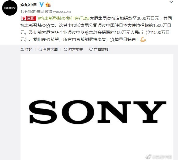 本文属于原创文章,如若转载,请注明来源:众志成城战“疫”情 索尼追加1500万捐款//diy.zol.com.cn/738/7382797.html