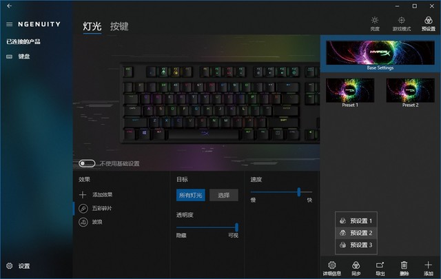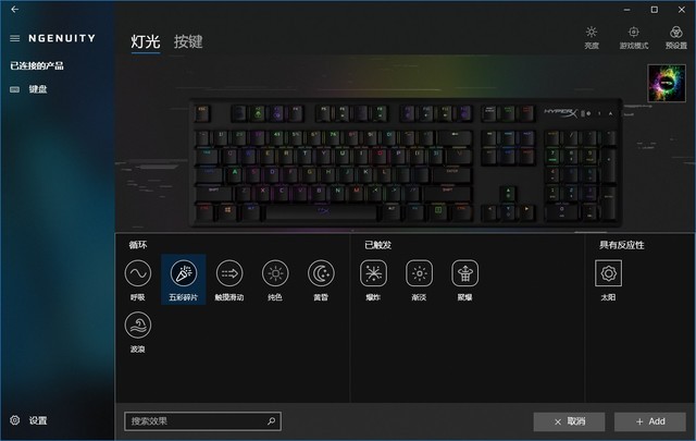 起源RGB游戏机械键盘不仅色彩更明亮,而且光效是可以个性定制的,只需要通过HyperXNGENTITY专业定制软件。随机自带有六种预设光效——颜色循环、光谱涟漪、呼吸、常亮、5个区域和极光。其中,5个区域可根据自己的喜好定制键盘五个区域的颜色,并可以通过内置芯片保存三组自定义配置文件,保存之后即使不在本机使用也可调用自己个性的灯光效果。