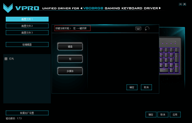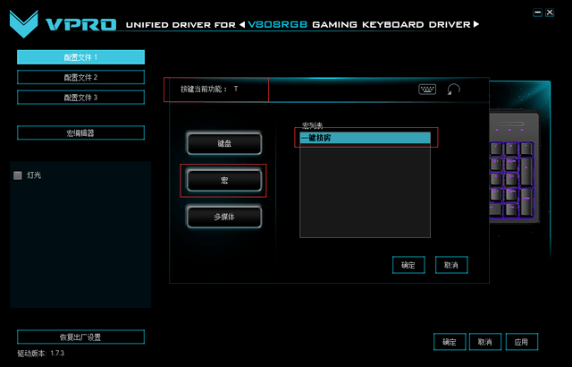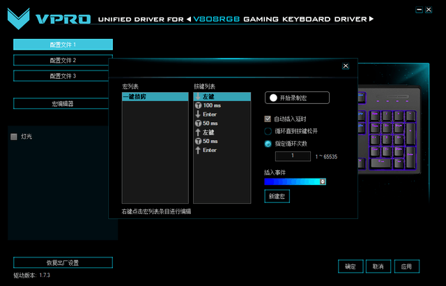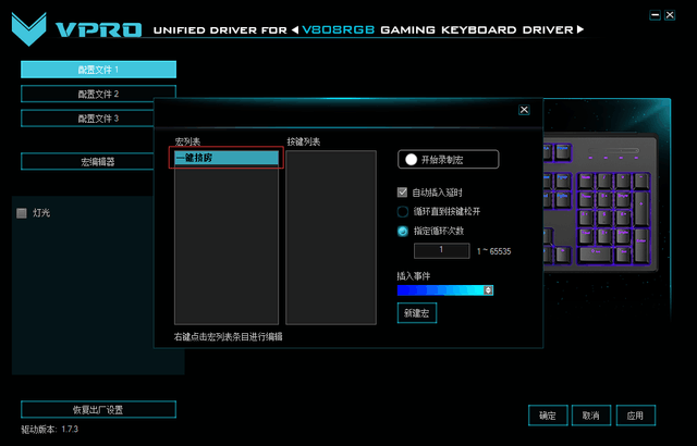 步骤一:打开驱动,选中雷柏V808RGB的宏编辑。点击“宏编辑器”,再点击右下角的“新建宏”,命名为“一键挤房”。