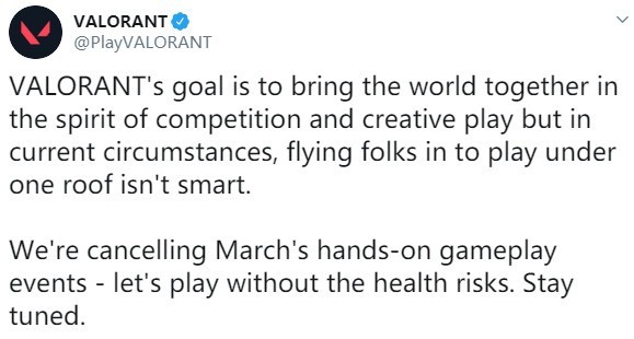 随着疫情发展,很多的职业赛事都已经由线下改为线上或者推迟进行,而就在近日,拳头开发的FPS游戏《VALORANT》考虑到当前的形式,而又考虑到参与者的健康安全,决定取消了主播试玩活动。