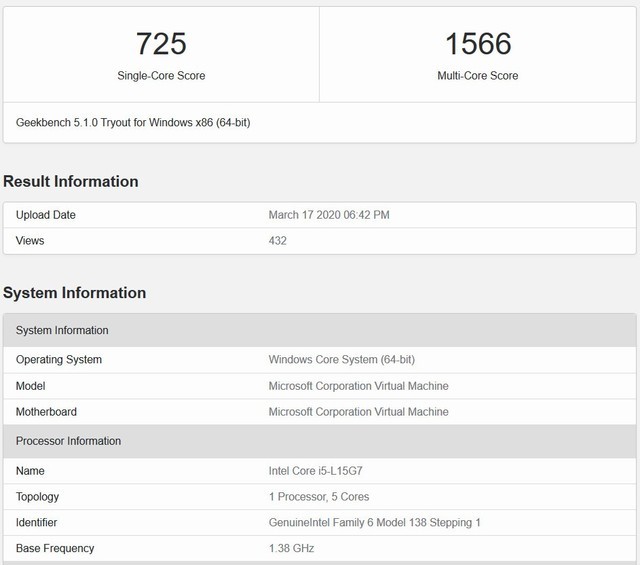 根据GeekBench 5的结果,酷睿 i5-L15G7是一个基频为1.4 GHz的处理器,而在测试中,它的速度高达2.95 GHz。单核测试中该芯片得分为725分,而多核测试结果为1566分。