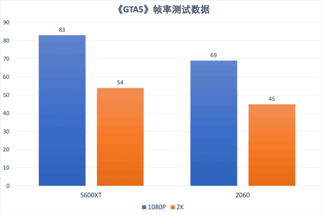 为了体现这款显卡的性能,小编找来一款定位和RX 5600XT相差不多的RTX2060一同来进行《GTA5》游戏的实测。在8倍MSAA,最高特效的设置下,1080P分辨率下,5600XT的表现更加突出,达到了83帧;而在2K分辨率下,5600XT也能够达到54帧,比较接近满帧流畅运行,RX 5600 XT的帧数平均领先RTX2060约20%。