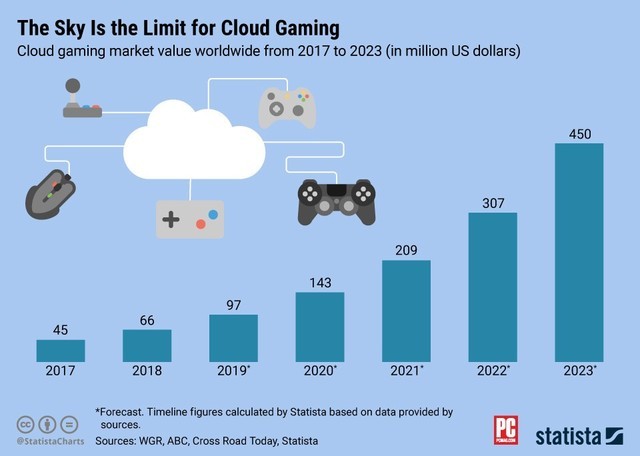 除了谷歌的Stadia,微软的Projectx Cloud、苹果的Apple Arcade,NVIDIA GeForce NOW等等大厂也都拿出了自己的云端游戏平台解决方案,利用越来越强大的服务器计算能力和专业级的GPU图形计算核心,在高度集中的密集化服务器机群之中为全世界的游戏用户提供云端游戏服务。早在去年云游戏刚刚崭露头角的时候,知名互联网数据中心Statista就曾预测在未来的几年时间云游戏产业将会迎来成倍的增长。
