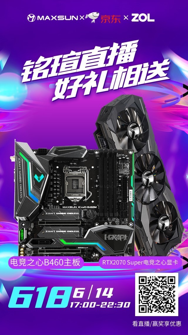 6月14日下午5点,在zol官方直播间,大家可以见到性能强劲的铭瑄RTX 2070 Super电竞之心显卡,以及刚刚上市的铭瑄电竞之心B460M主板。笔者也会作为嘉宾,进入直播间给大家详细讲解这两款产品的细节,以及618购物节由铭瑄给大家送来的巨大优惠福利。