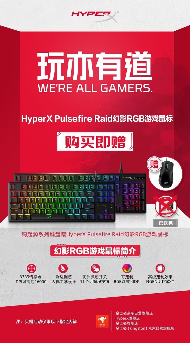 618活动期间,起源系列键盘的买赠活动推出后,粉丝们的热情空前高涨,起源系列键盘的关注度也在不断攀升。6月16日至18日,活动终于推向高潮——买HyperXAlloy Origins起源RGB游戏机械键盘(水轴、红轴)或HyperXAlloy Origins Core起源竞技版RGB游戏机械键盘(水轴、红轴)将获赠HyperXPulsefire Raid幻影RGB游戏鼠标,数量有限,送完即止。要知道,幻影RGB游戏鼠标的日常售价为399元,如此豪礼可谓千载难逢。