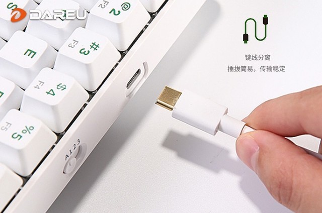 达尔优EK861双模机械键盘支持有线+蓝牙5.0无线连接两种连接模式。有线连接采用主流的Type-C连接线,让你的手机和键盘可共用连接线;达尔优EK861双模机械键盘内置1900mAh锂电池,关闭背光模式下可连续使用约20天,打开背光模式下可连续使用约4天,充电状态下亦可正常使用,为你提供更持久的续航。
