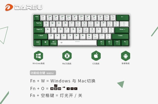 通过FN+W即可实现Windows与Mac系统的按键切换,给你更舒适的跨平台操作体验;FN+O即可进行方向键切换,游戏与办公尽在一“键”之间。