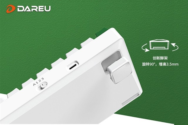 达尔优EK861机械键盘采用创新型的可调节磁吸脚架设计,90°旋转磁吸脚架即可将键盘抬高3.5mm,给你更舒适的输入角度。