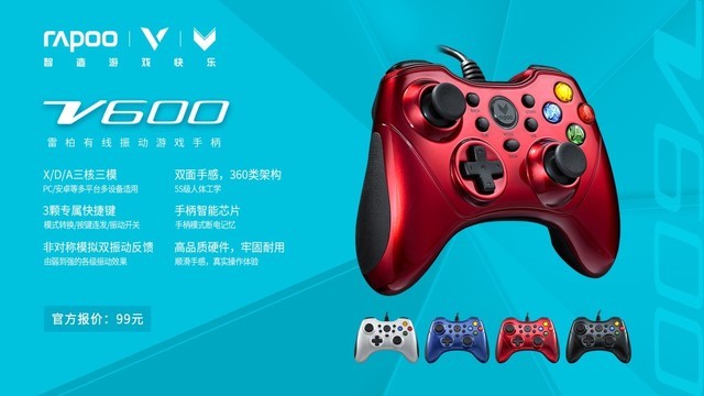 双面手感——雷柏V6002020版有线振动游戏手柄是国产外设领军品牌,实力大厂上市企业——Rapoo雷柏旗下游戏V系列外设日前推出新近王牌游戏手柄,经典延续。延续了99元的爆炸性价比,喷砂镜面+硬质磨砂的双面手感,5S级人体工学、360类手柄外观架构;X/D/A三核三模,一键切换,满足不同平台使用;专属VIB振动开关键、专属TUR连发快捷键;非对称模拟双振动马达;智能手柄芯片,手柄模式断电记忆,固件可升级;高品质硬件,快速响应,奠定了雷柏V600强悍实用的标签。