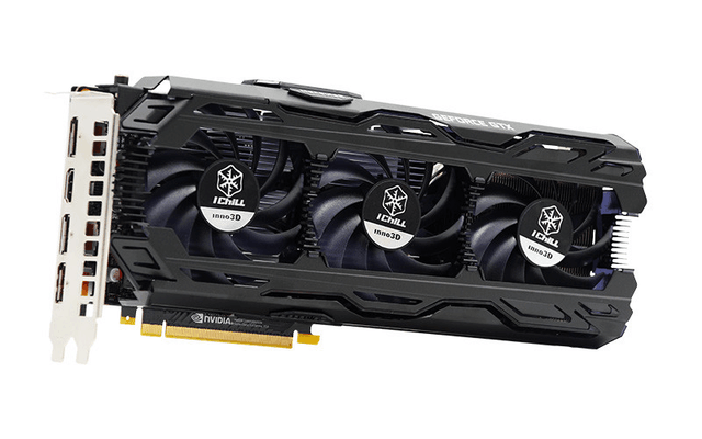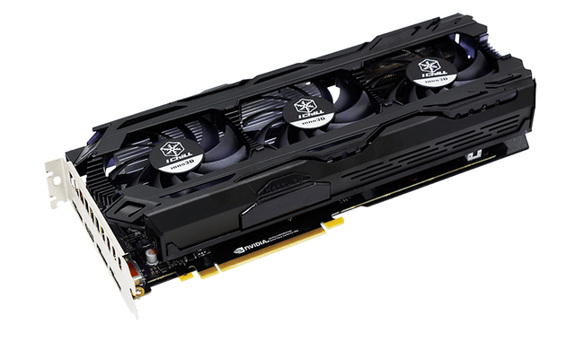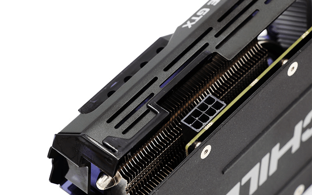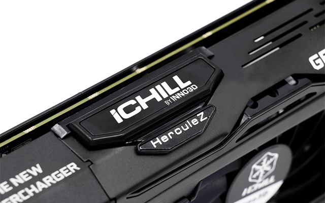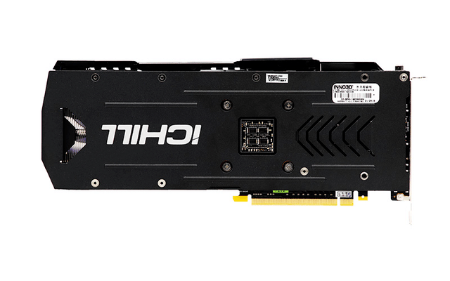 这款显卡的背面安装了一块一体式金属背板,印着白色加粗“iChiLL”Logo的纯黑色金属背板,在加固和保护PCB的同时还能起到辅助散热的作用。