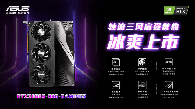 下面为大家介绍一款支持光追的华硕显卡。华硕GeForce RTX2060 SUPER GAMING3显卡,简约外形下面隐藏着强大的性能,显卡搭载的SUPER系列RTXGPU核心,支持多种业界领先的游戏功能,具备更强的综合性能和光线追踪的优秀表现,带给玩家优质的NVIDIATuring 游戏体验。TuringGPU配备高速GDDR6显存,可体验高达496GB / s的内存带宽,高分辨率游戏可更有效地处理游戏的计算速度,全新高性能三风扇,势必给玩家带来更优质的PC游戏体验!