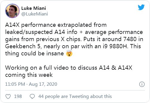 据外媒了解,有科技博主@LukeMiani 在Twitter上分享了一些泄露数据,强调了A14X Bionic芯片的性能提升,称之几乎可与Intel酷睿i9-9880H(功能强大的八核芯片)一战。
