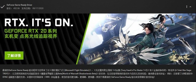 8月17日,NVIDIA官方发布了452.06最新GeForce Game Ready驱动,新的驱动对《微软飞行模拟》,《托尼霍 克职业滑板1+2合集》和《全面战争传奇:特洛伊》,以及即将到来的魔兽世界资料片,支持光线追踪的《魔兽世界:暗影之境Beta》的支持。