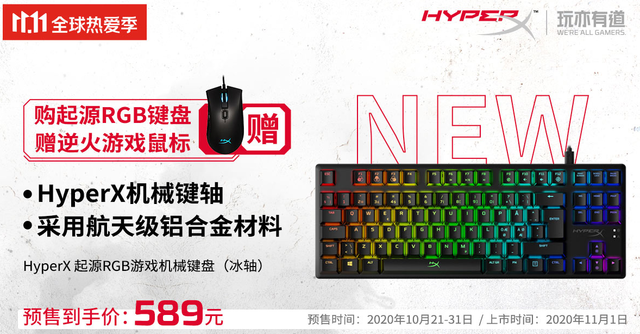 第三重礼是福利买赠,购买HyperXAlloy Origins RGB起源系列游戏机械键盘或HyperXAlloy Elite2阿洛伊精英2游戏机械键盘就送HyperX游戏鼠标。活动仅限11月1日-11日,数量有限,送完即止。