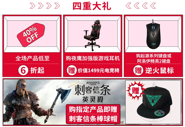 第四重礼是刺客信条粉丝的福音。11月1日-11日,购买指定HyperX游戏外设,并在11月18日前按活动要求晒单的前100名消费者,将获得刺客信条棒球帽一顶。
