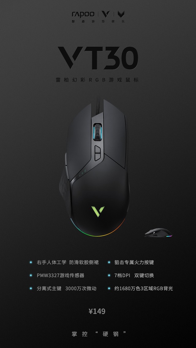 近日,领军国产外设品牌,实力大厂上市企业——Rapoo雷柏,推出旗下高端电竞VT系列又一款新品VT30幻彩RGB游戏鼠标。非对称的锋锐造型,以及精心勾勒的曲线,让玩家能更持久舒适的掌控。VT30的配置也诚意满满,PMW3327游戏传感器、3000万次微动开关、约1680万色RGB背光系统,并配有专属的狙击火力按键,降低准心抖动,给予敌人更准确的打击。下面就让我们来详细了解下VT30的强悍性能吧。