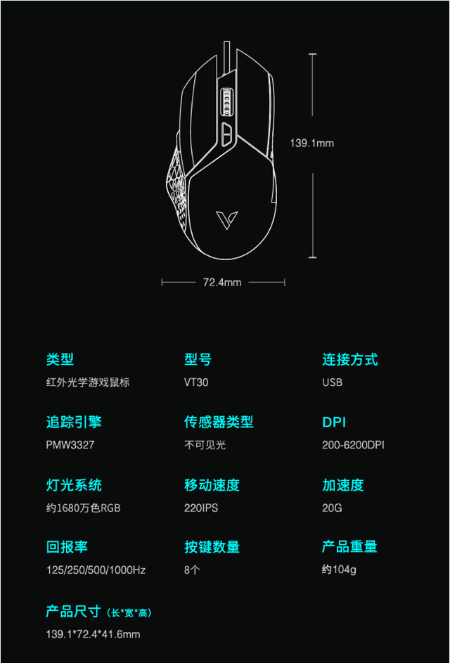 雷柏VT30拥有PMW3327游戏传感器,专为射击类游戏配置的狙击专属火力按键,强悍的硬件配备,贴心实用的功能,个性化的背光系统,再加上149元的诚意价格,无疑是一款掌控“硬钢”的实力悍将。完整参数请见下表。