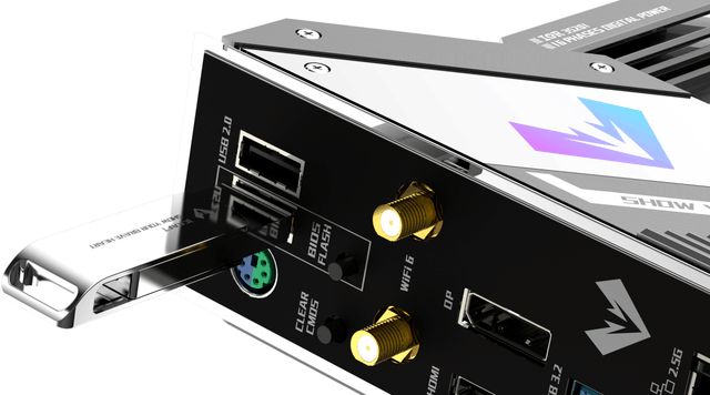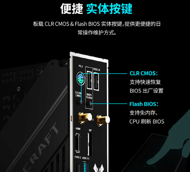 铭瑄iCraft B550M主板在Clrmos按钮旁边设置了一键重写Bios的FlashBios功能,玩家只需要有Bios文件的优盘插在对应的USB接口上,按下按钮后,即可完整重写主板的Bios,让主板随时满血复活。