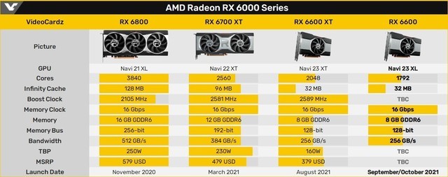 AMD的RX 6000系列显卡已经到RX 6600 XT了,再往下一款就是RX 6600,此前已经确认是8GB显存,三风扇设计,不过发布时间比预期晚,要跳票到10月份了。今年显卡市场形势多变,AMD及NVIDIA两边的产品布局都有些意外,RX 6700显卡一直没影子,RX 6600显卡原本是跟RX 6600 XT一起发布的,现在也明确发布时间,之前说拖到9月,现在又说拖到10月。