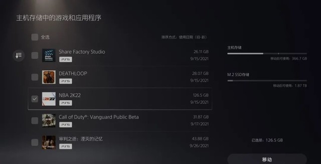在PS5的菜单右侧,可以看到增加了1.87TB的M.2SSD存储空间,原本1TB的内置存储已经所剩不多了。下面我们就来做一下游戏转移的测试,来实际看看加装的这个微星SPATIUM黑竞M4802TBSSD的速度,和PS5原本内置的SSD速度会有什么样的区别?