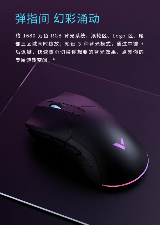 精心勾勒的曲线,前半部分下凹后缓缓回升,为手指预留放置空间,侧裙孔状纹理工艺具备排汗效果并有着出色的防滑性能,长时间游戏亦能持续好的手感。1680万色RGB背光系统,滚轮区、Logo区、尾部三区域同时绽放,通过内置驱动可自定义背光颜色,千丝万缕,光影交织,弹指间幻彩涌动,快来打造专属于你的电竞色彩。