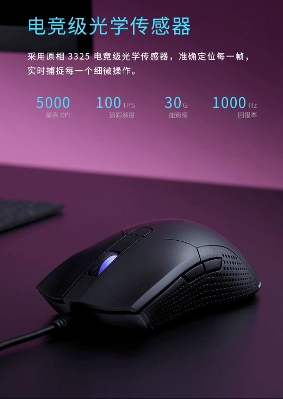采用了原相3325电竞级光学传感器,准确定位每一帧,1ms的疾速响应,能更好的帮助玩家实现游戏中各种细节微操。帮助玩家更好打出走A、光速QA等细节连招,好比一款物理外挂。