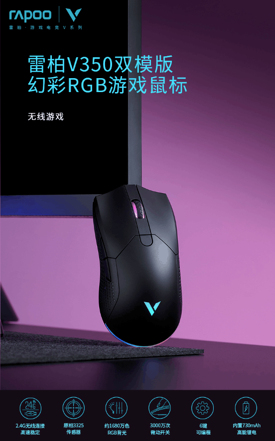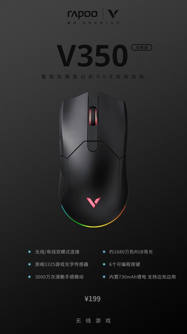 雷柏V350双模版幻彩RGB游戏鼠标已正式上市,只需199元,支持有线/无线两种方式、原相3325传感器、7档DPI、6个可编程按键、内置可循环充电锂电池。1680万色的RGB背光系统,感兴趣的朋友们千万不要错过。