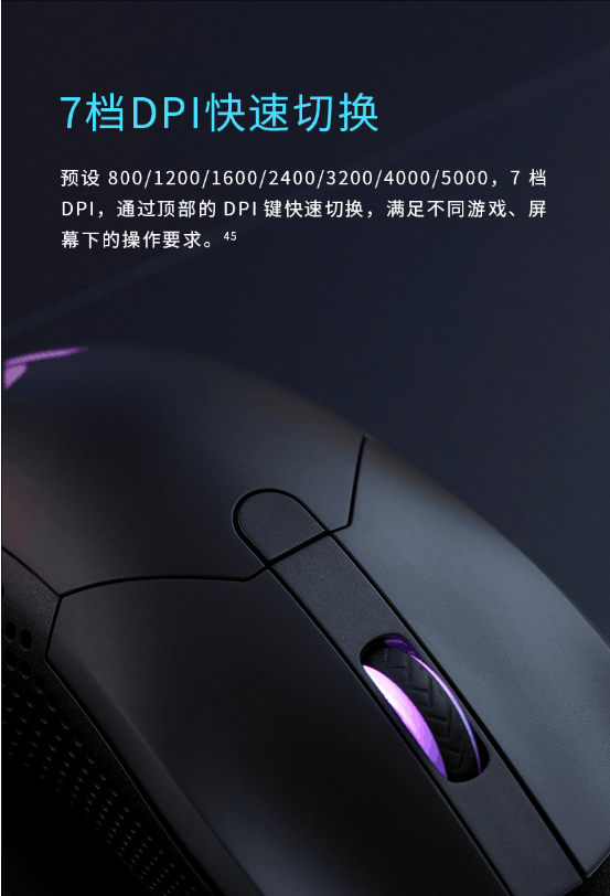 预设800/1200/1600/2400/3200/4000/5000,7档DPI。6个可编程按键,通过驱动设置,根据不同游戏调节适合自己的灵敏度,录制自定义宏,化繁为简,方便快捷。内置3000万次微动开关,持久耐用,手感爽脆,回弹迅速,不再为鼠标寿命而担心。