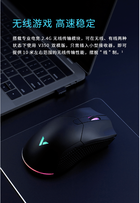 拒绝安于“线”状,V350双模版游戏鼠标搭载着2.4G无线传输模块,可在无线/有线两种状态下使用,插入小型接收器,即可摆脱“线”制,开启无线游戏时代。