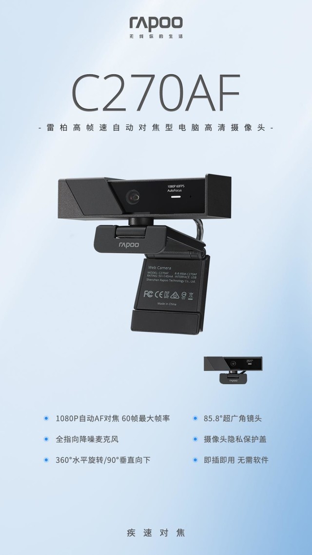 随着网络的高速发展,直播、网教等都愈发热门,摄像头也成了必不可少的单品。领军国产外设品牌,实力大厂上市企业Rapoo雷柏推出C270AF高帧速自动对焦型电脑高清摄像头,1080P全高清自动对焦、60帧高帧速、内置全指向降噪麦克风,并且支持360°水平旋转。跟着小编一起来对这款电脑摄像头做更深的了解吧。