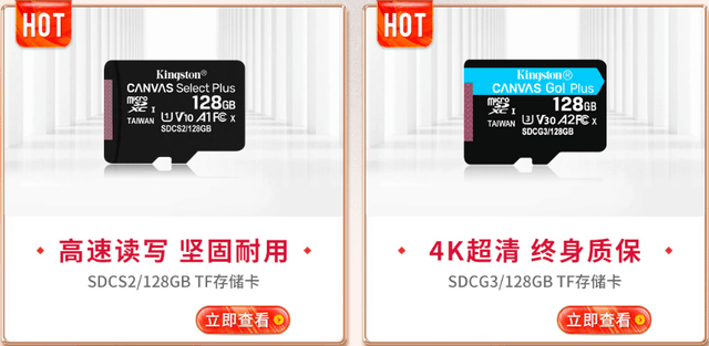 存储卡选择有学问,经济实惠金士顿SDCS2存储卡128GB,智能手机、可穿戴产品等数码产品均可使用,但如果拍摄4K超清视频或者连拍摄影,推荐金士顿SDCG3存储卡128GB,更高的读写速度有效避免视频丢帧、失声,图像缺失等因为速度问题导致的数据缺失。